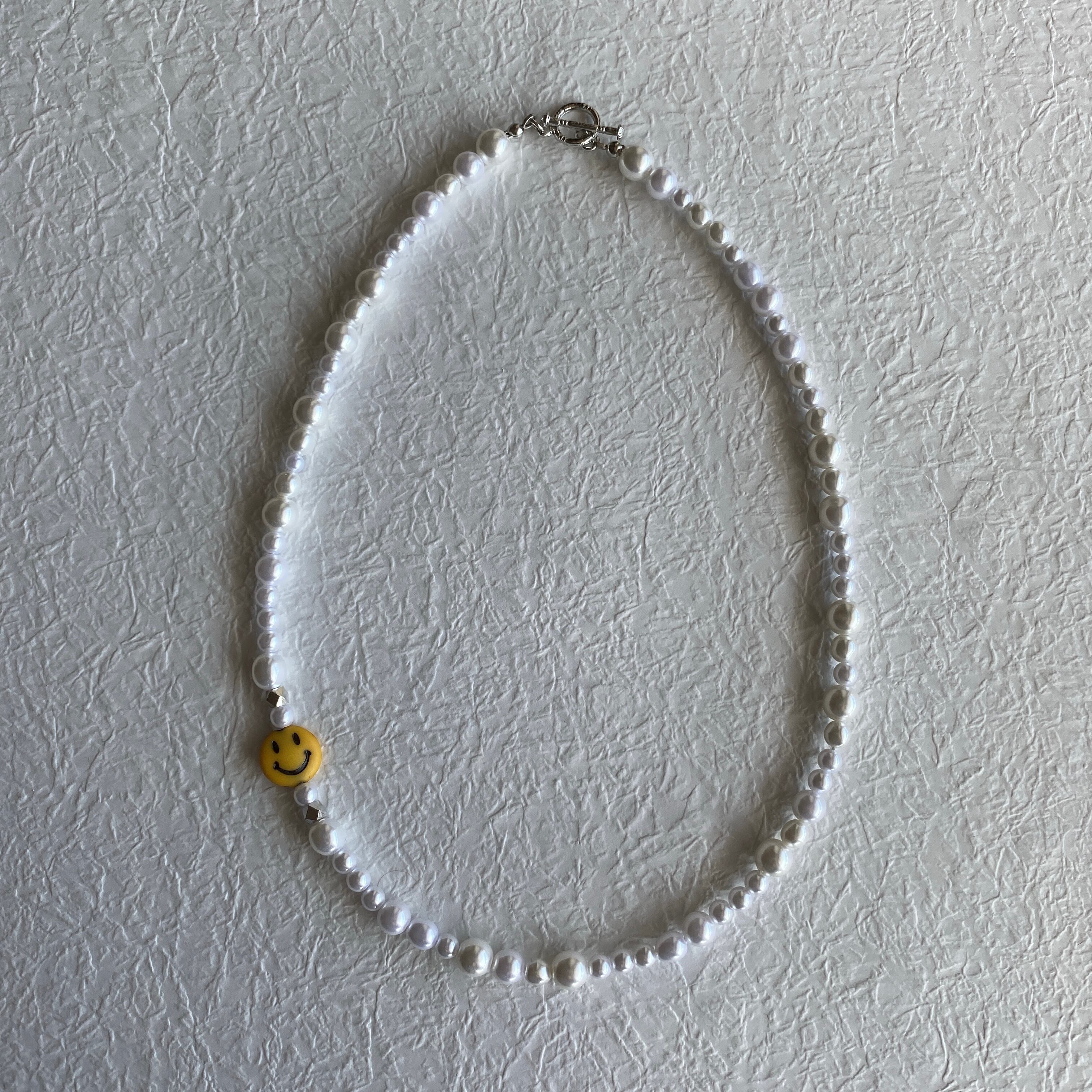○パールビーズとシルバーパーツを使った、ニコちゃんパーツが可愛いネックレスです☺︎