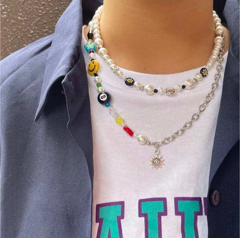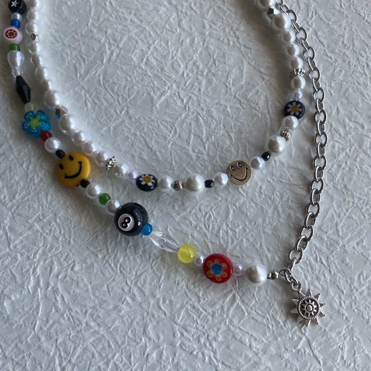 ○ミルフォオリやパールビーズを使ったシルバーチェーンとのハーフハーフネックレスです☺︎