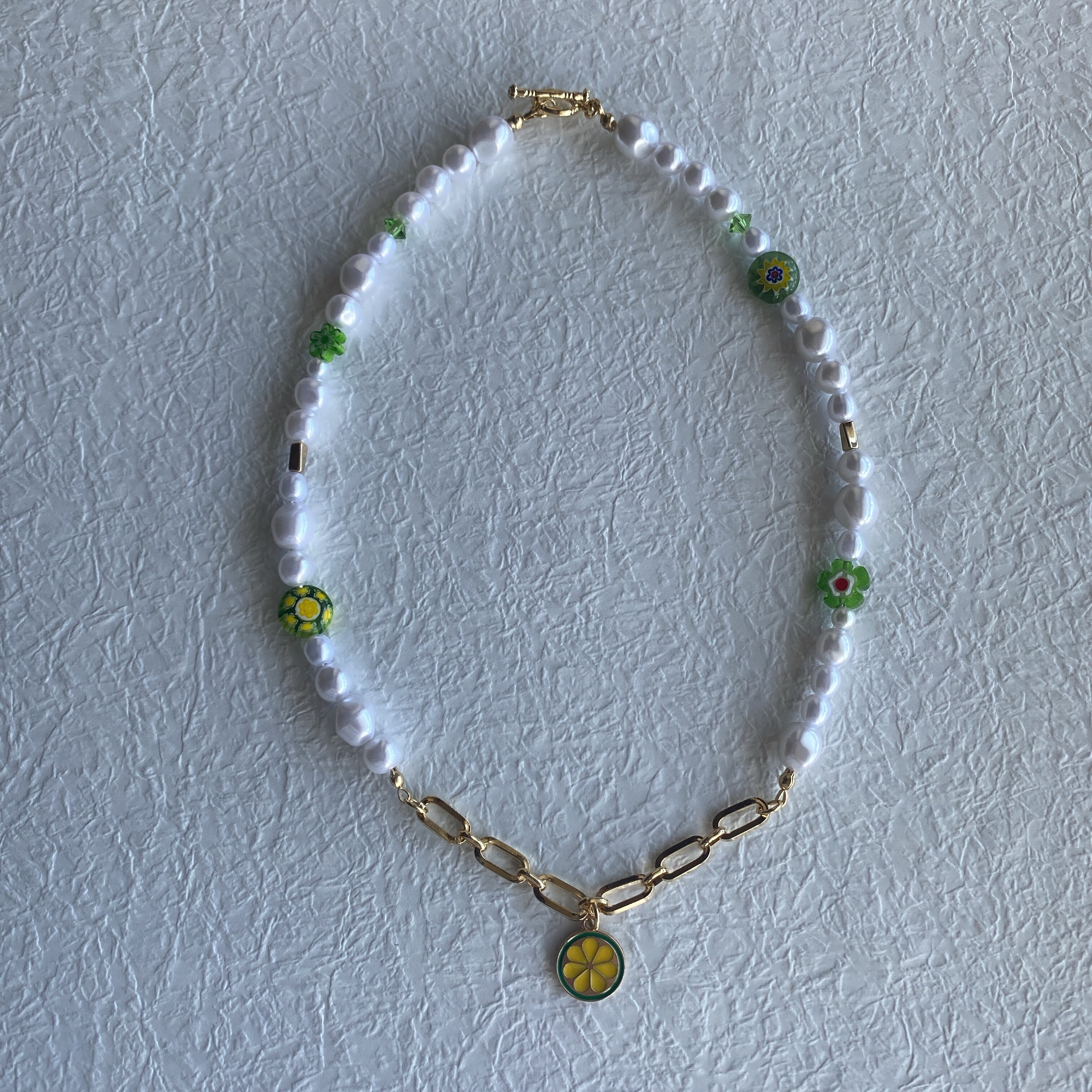 ○パールビーズとグリーン系のミルフォオリを使ったネックレスです♪